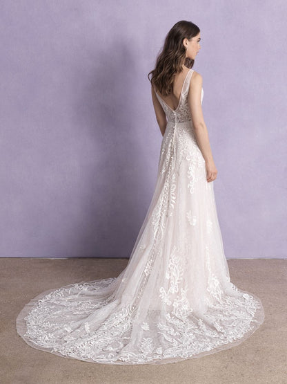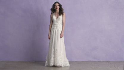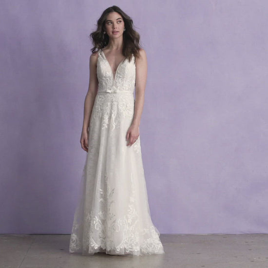This Allure signature 3355 A-line gown is exquisitely cut with a feminine silhouette to flatter any figure. Swathed in a delicate layer of soft fabric, this dress captivates with the most delicate slim bow belt to add a dash of timeless elegance. The perfect choice for any special occasion.