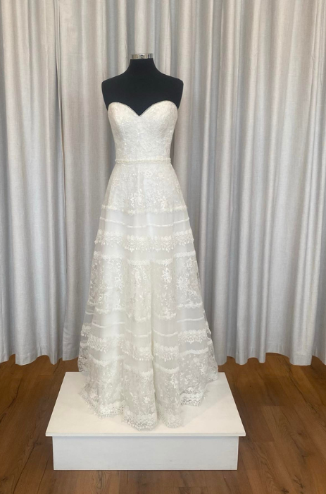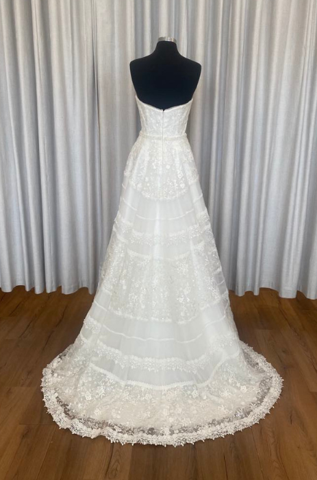 Get ready to walk down the aisle in style with our 6012 wedding gown! This strapless, sweetheart gown exudes a boho vibe with its eclectic lace borders and fringed hemline detailing. Its unique design will make you stand out on your special day.