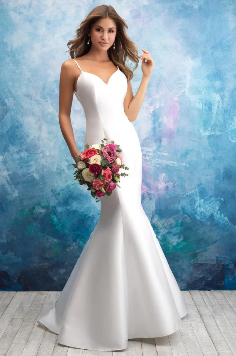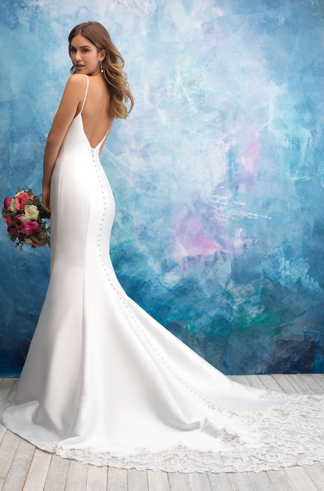 Crafted with exquisite mikado fabric, the Allure 9558 is a mermaid dress that offers a sleek silhouette. Its V-neck and V back add a touch of elegance, while the button detailing along the back leads to a stunning lace train. Perfect for a sophisticated and timeless look.