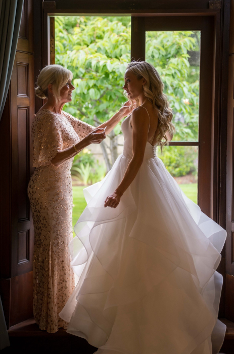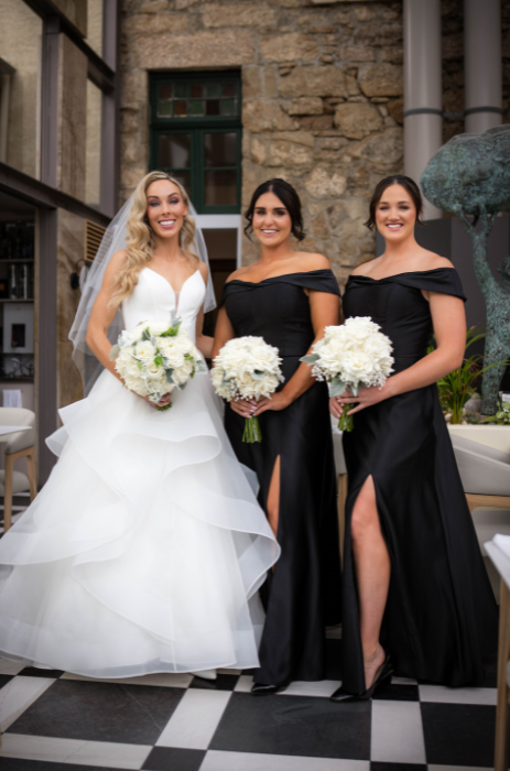 The whole wedding party was dressed by us, with both of her bridesmaids wearing luxurious black morilee satin bridesmaid dresses, and her gorgeous Mum chose her Miss Anne gown from us too.