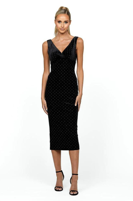 Classic cut, in a cutting edge fabric.  This empire line midi dress from Bariano is made from sumptuous black velvet and embellished with pin head size brushed silver studs.