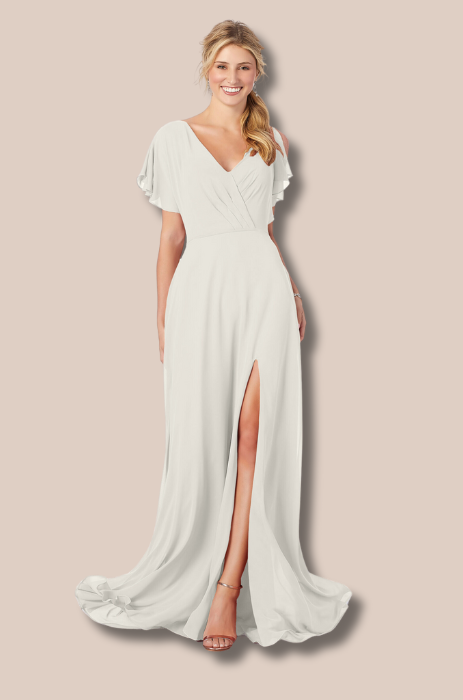 Flit into any occasion with this playful chiffon dress featuring flutter sleeves and a flirty split. Perfect for dancing the night away or turning heads at a summer wedding. (Chiffon, flutter, split, playful, flirty, dancing, turning heads, summer)