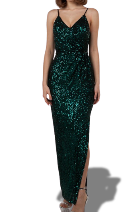 Step out in style with the Dolly dress! This sparkly v neck cocktail dress features stunning sequins and a side leg split for a touch of glamour. Perfect for any special occasion, this dress will make you stand out and feel like a star. Get ready to turn heads and shine all night long!