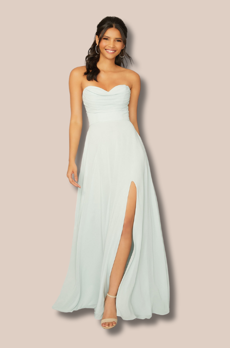 Get ready to turn heads with this stunning chiffon dress! The draped sweetheart bodice adds a touch of elegance, while the front skirt slit adds a daring and playful element. Perfect for a night out or a special occasion. (Bet you'll be the center of attention!)