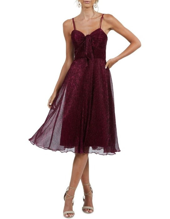 Bring out your inner princess with Emily By Bariano! This beautiful plisse dress is crafted from shimmering metallic fabric and features a timeless sweetheart neckline with an adorable bow detail. Its above-the-knee length and flippy skirt will make every twirl feel like you are floating on air! Sparkle on!