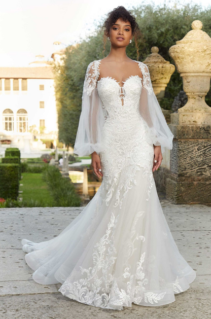 Introducing Fabiana by Morilee: the epitome of timeless elegance. Expertly crafted with frosted medallion lace and a textured sweetheart bodice, this exquisite mermaid silhouette boasts a peek-a-boo detail for a sultry, alluring look. Illusion detailing on the sides and back sculpts an exquisite silhouette, while a sheer, appliquéd train lends that extra air of romance. Detachable, tie-back bishop sleeves complete this elegant look with a hint of effortless whimsy.