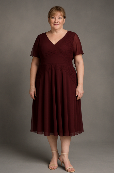 This playful knee-length dress features a soft stretch fabric base with an ethereal tulle overlay that twirls beautifully with every step. The flattering V-neckline and fluttery sleeves add a touch of whimsy, while delicate applique details adorn both the neckline and waist for that extra special touch. Perfect for dancing the night away!