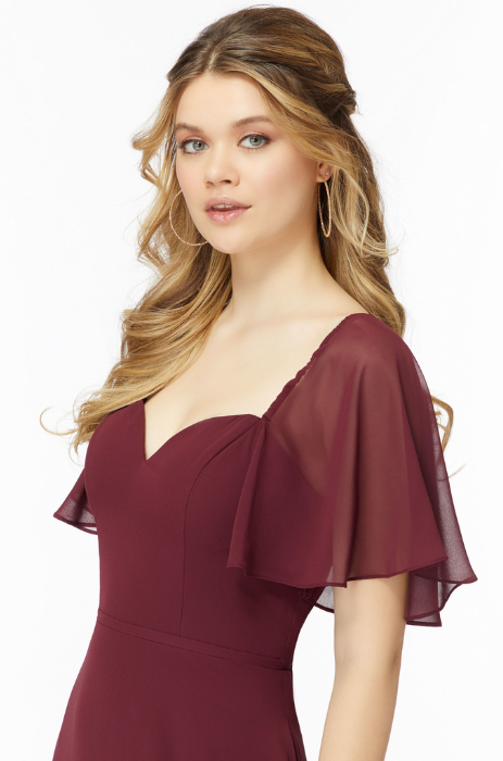 This special order Chiffon Flutter Sleeve Bridesmaid Dress is a playful twist on a classic design. The sweetheart neckline and flutter sleeves add a touch of romance to this dress, while the tied keyhole back adds a unique, unexpected detail. Perfect for any fun-loving bridesmaid!