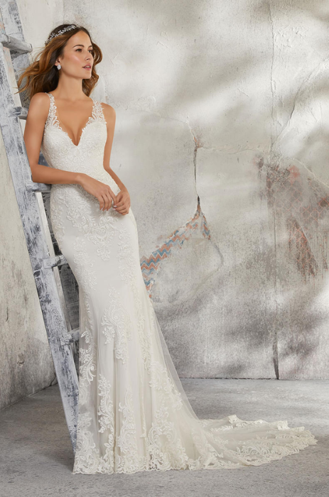 This exquisite Leia wedding gown boasts a delicate lace v-neck design and an illusion back adorned with buttons. The full train features a stunning lace border, making this gown a timeless and elegant choice for any bride. Elevate your special day with the luxurious style and intricate detailing of Leia.