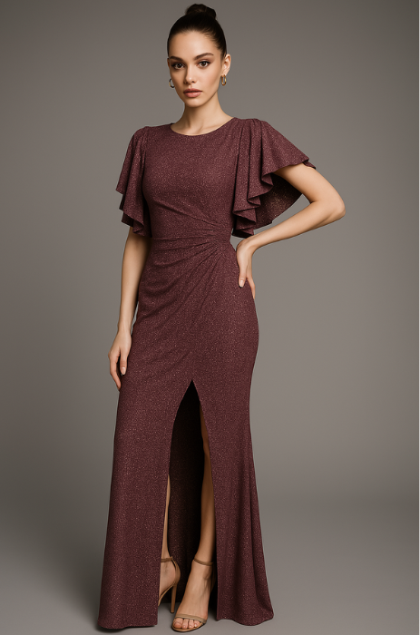 Add some sparkle to your wardrobe with our Lurex stretch flutter sleeve dress! Made from stretch lurex fabric, this dress features an elbow length flutter sleeve and a round neckline. With a leg split detail, this dress is perfect for adding some fun and flair to any occasion.