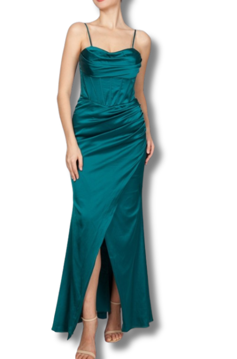 Get ready to turn heads in our Satin Corset Style Gown! Made with luxurious soft satin, this gown features a boned corset style bodice for a stunning silhouette. Feel confident and elegant in this statement piece. Perfect for any special occasion.