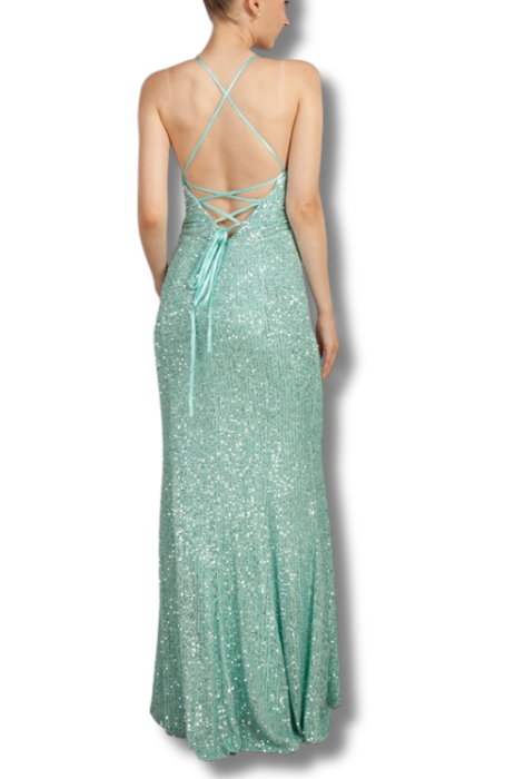 Shine bright in this playful sequin gown featuring a draped bodice that adds a touch of elegance and a strappy back that keeps the look flirty and fun. Perfect for making a dazzling entrance at any special occasion.