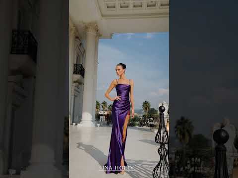 Dazzle the night in this rich purple satin gown with a dramatic side leg split. Sparkling jewelled straps and a square neckline add a touch of glamour. Perfect for special occasions.