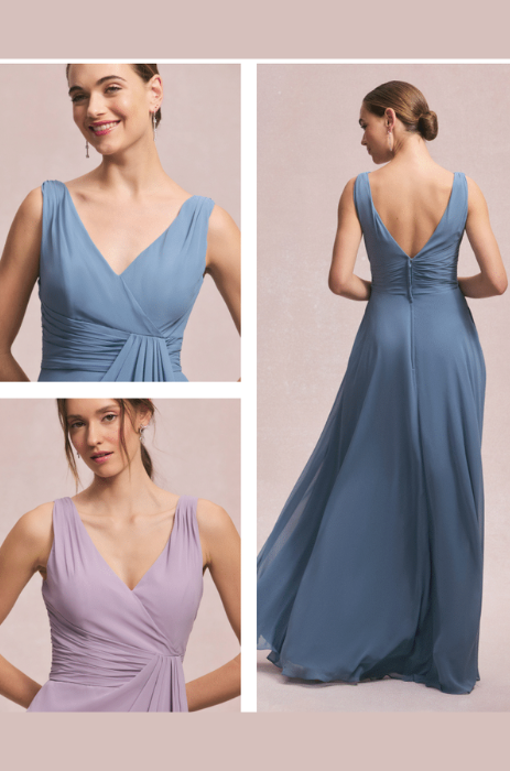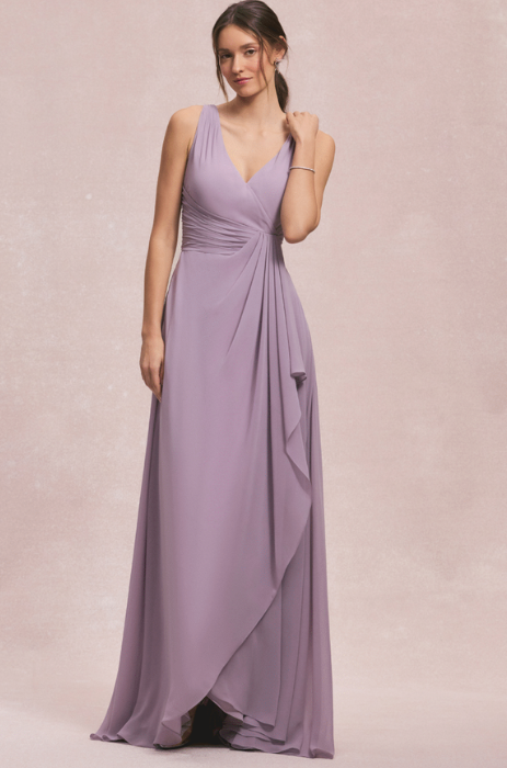 Float down the aisle in this dreamy V-neck chiffon bridesmaid dress. The draped waist detail and chiffon ruffle add a touch of whimsy to your look. You'll feel like a romantic fairy tale come to life, all while keeping your cool in the lightweight fabric.