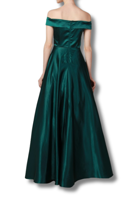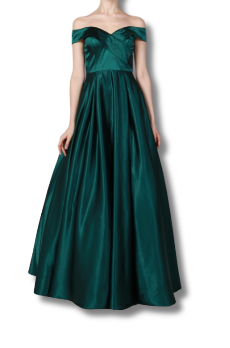 This teal satin ball gown dazzles with a playful charm, featuring a flattering sweetheart neckline and delicate off-shoulder sleeves. Its smooth satin fabric flows gracefully, making it perfect for twirling the night away in style and comfort.