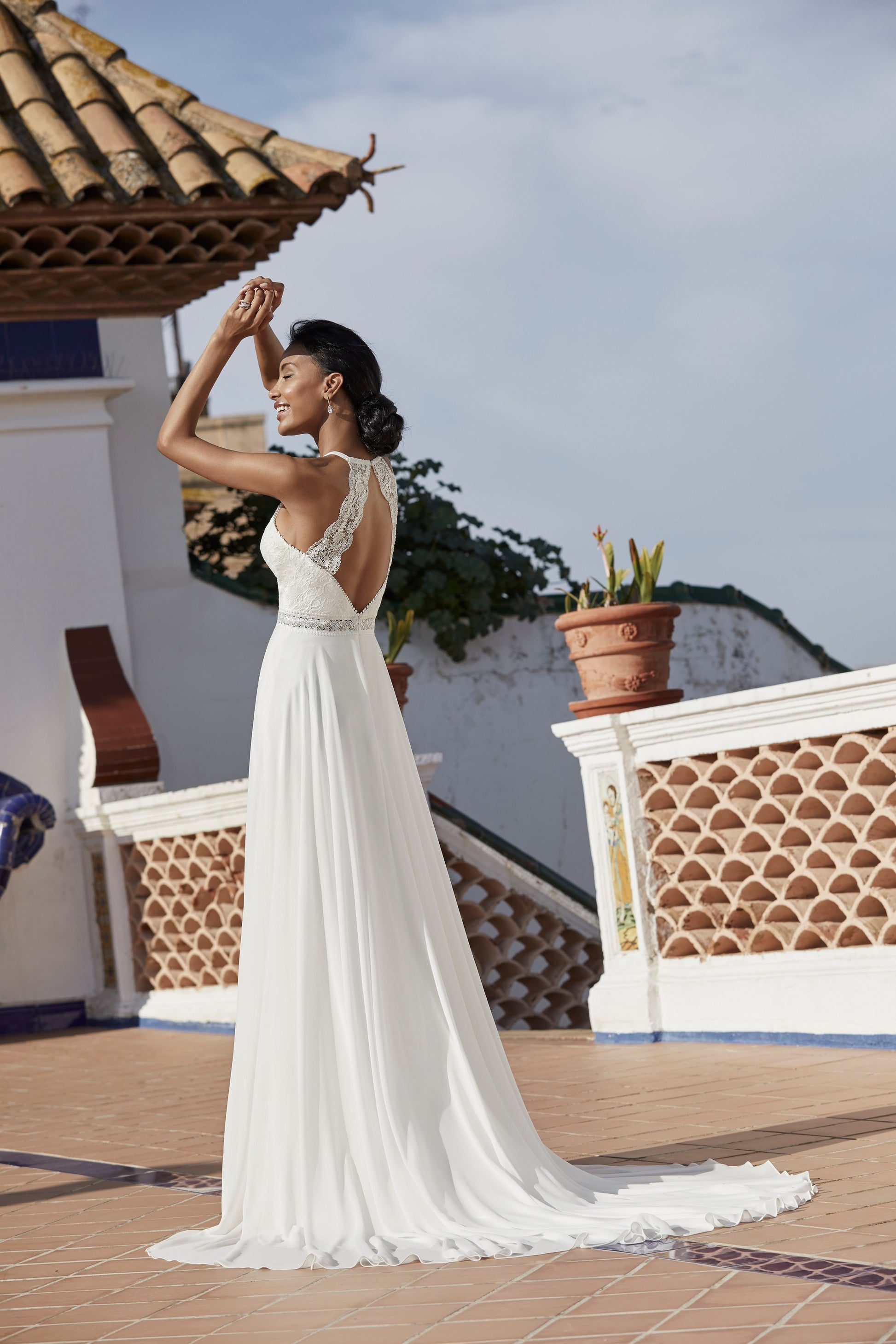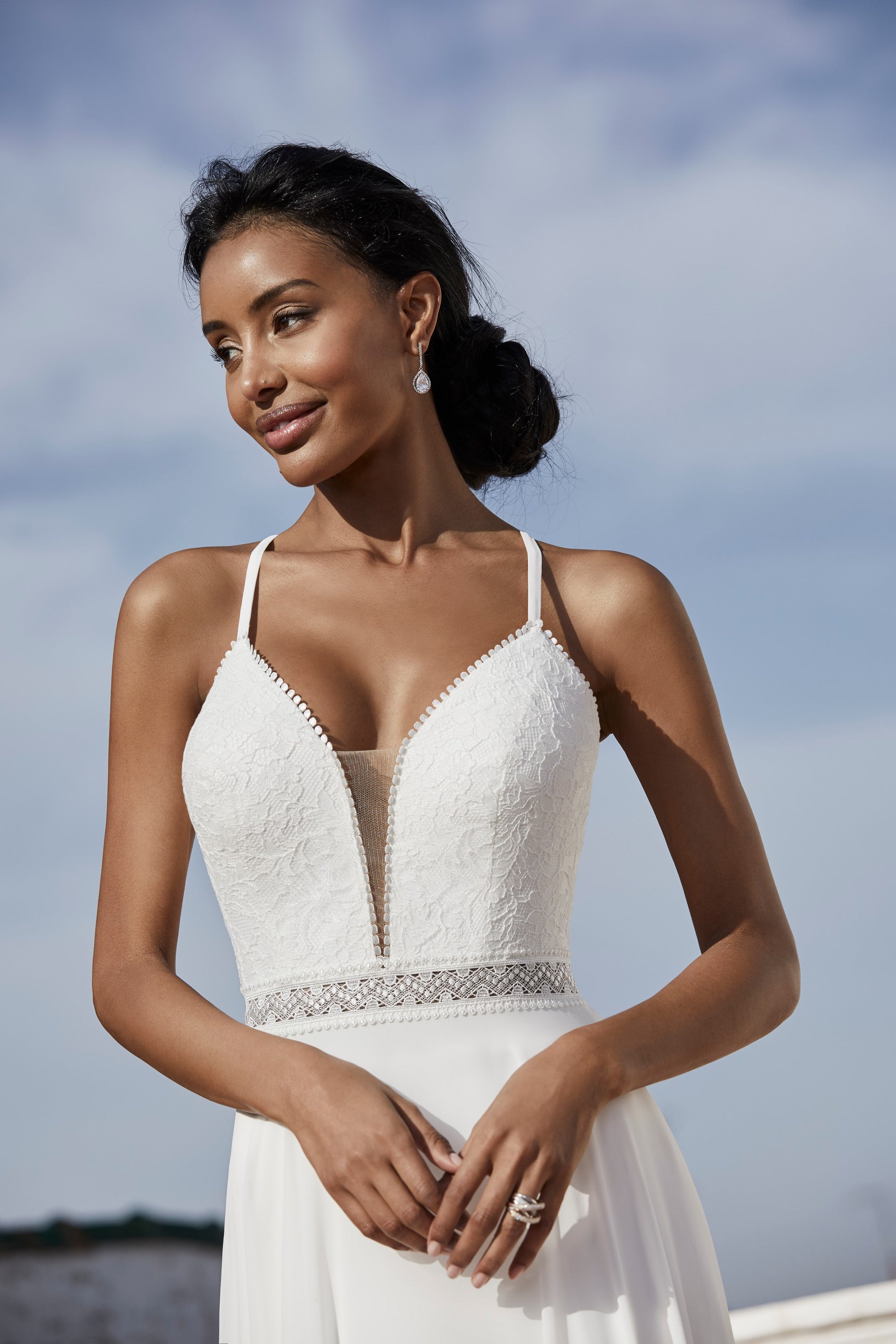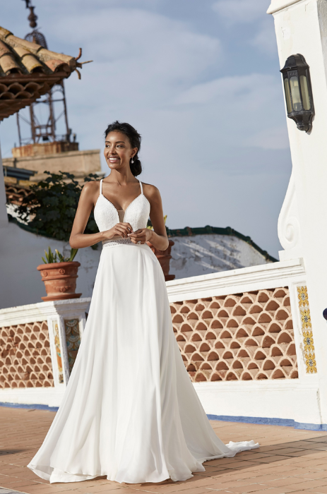 Capture elegance and understated sophistication in Ronald Joyce's Veda wedding dress. Boasting a chiffon A-line skirt and delicate straps, the dress is further complemented by a striking crochet waistband and plunging illusion neckline. Perfect for a destination wedding, Veda pairs perfectly with subtle jewellery and a chic up-do to show off the keyhole lace back detail, ensuring a timeless and tasteful look that will leave a lasting impression.